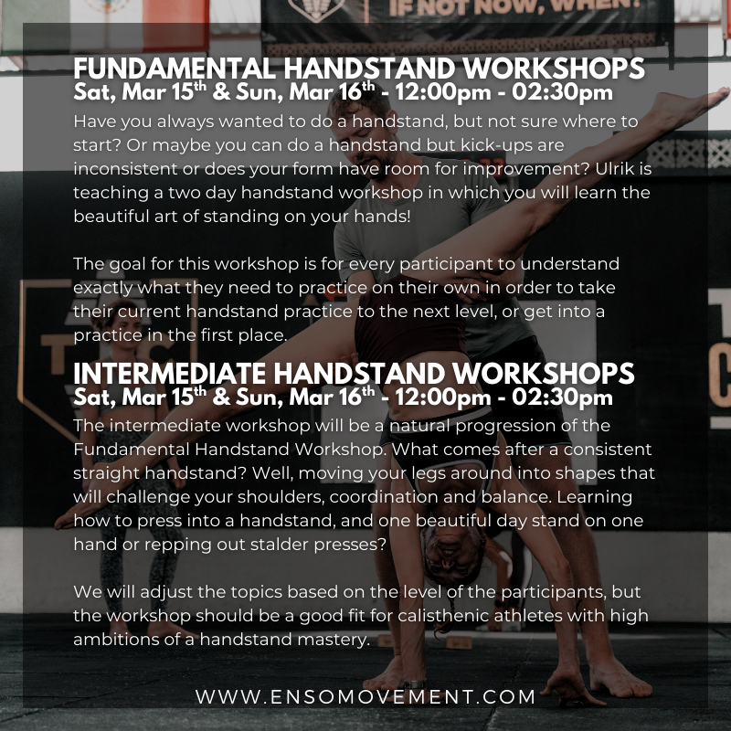 Have you always wanted to do a handstand, but not sure where to start? Or maybe you can do a handstand but kick-ups are inconsistent or does your form have room for improvement? Ulrik is teaching a two day handstand workshop in which you will learn the beautiful art of standing on your hands!