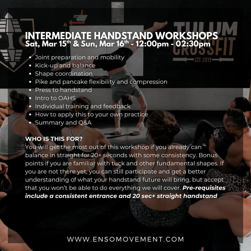 You will get the most out of this workshop if you already can balance in straight for 20+ seconds with some consistency. Bonus points if you are familiar with tuck and other fundamental shapes. If you are not there yet, you can still participate and get a better understanding of what your handstand future will bring, but accept that you won’t be able to do everything we will cover. Pre-requisites include a consistent entrance and 20 sec+ straight handstand